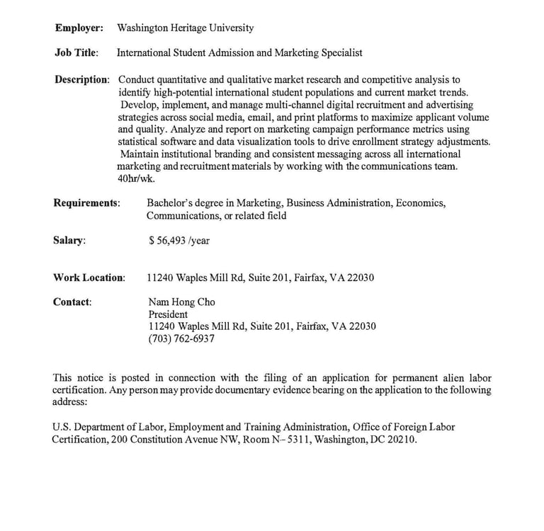 Washington Heritage University is looking to hire an International